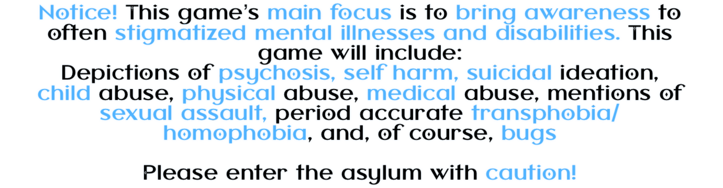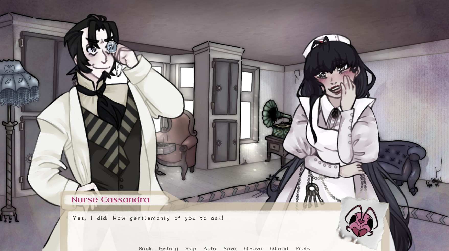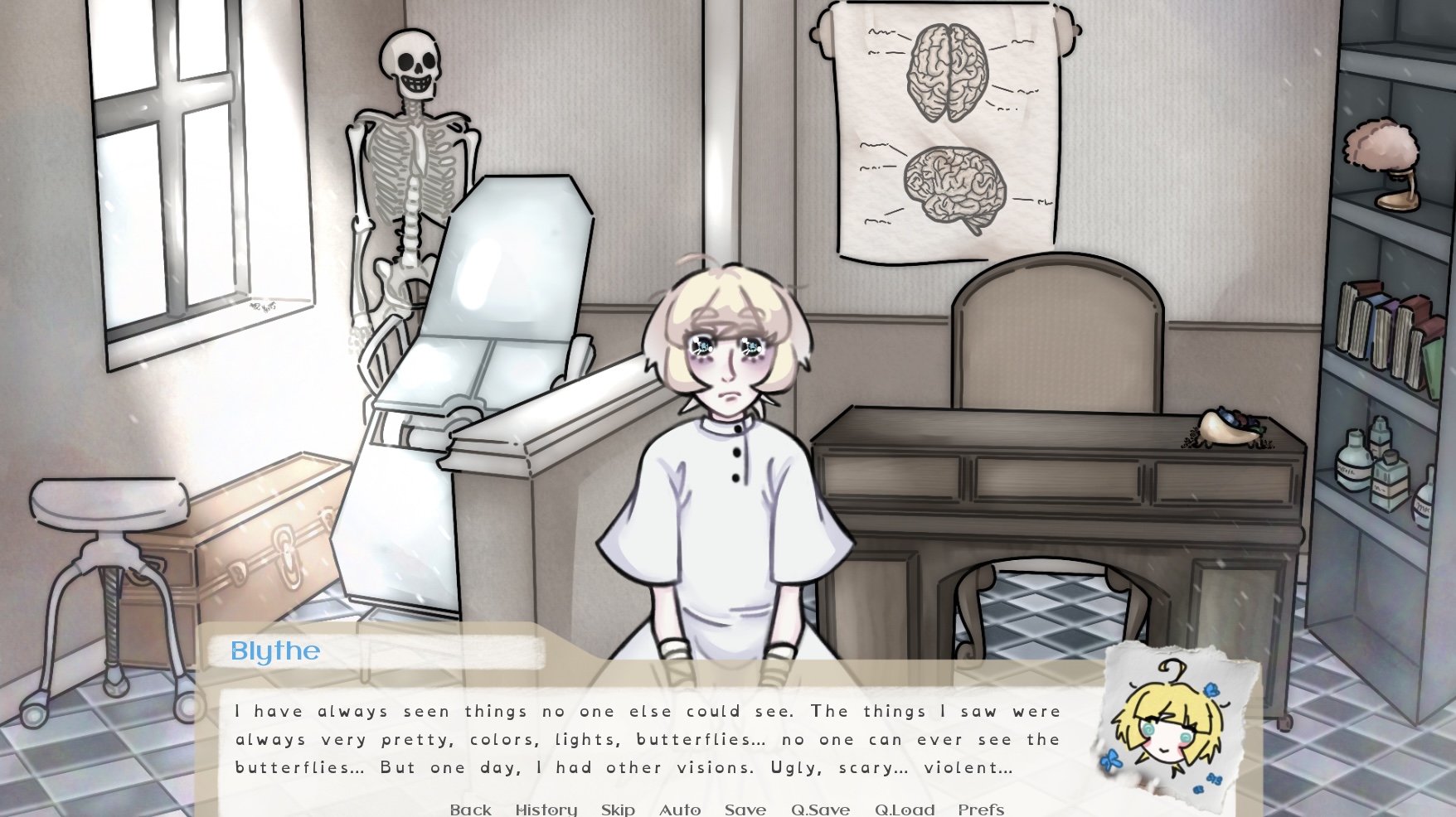 Pupa Project is a visual novel that has one set ending. Lepidoptera Lunatic Asylum opens its gates to you, beckoning you inside to come and pick up the pieces of splintered minds. Our story begins one year after Blythe Waldrop had been admitted to the asylum. Between navigating the harsh conditions of a Victorian institution, and learning what it means to truly heal, you will help Blythe understand what it means to be free.